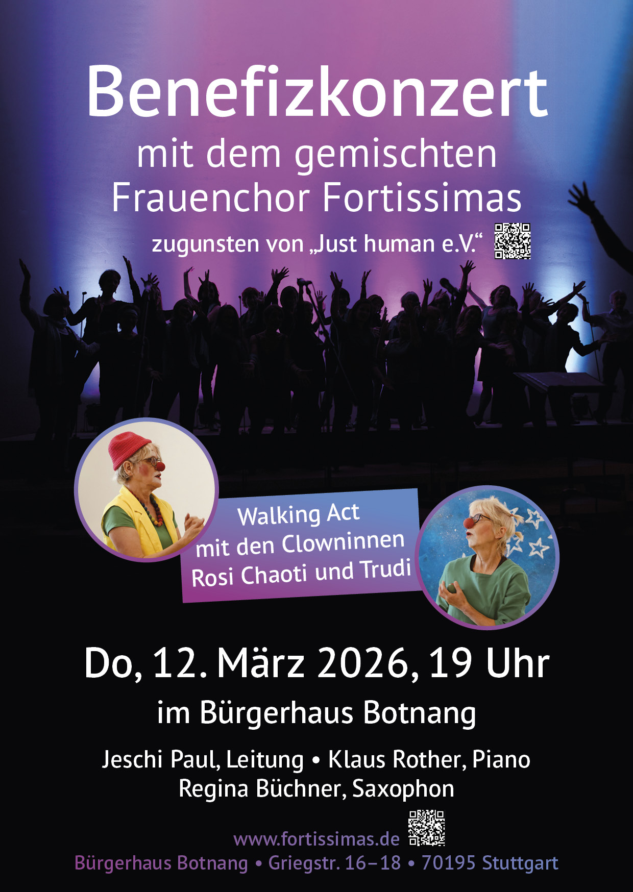 Wer am 8. März keine Zeit hat oder uns nochmal hören will, bekommt eine weitere Chance, denn am 12. März 2026 gibt es um 19 Uhr ein Benefiz-Konzert zugunsten Just human e.V. im Bürgerhaus Botnang.
