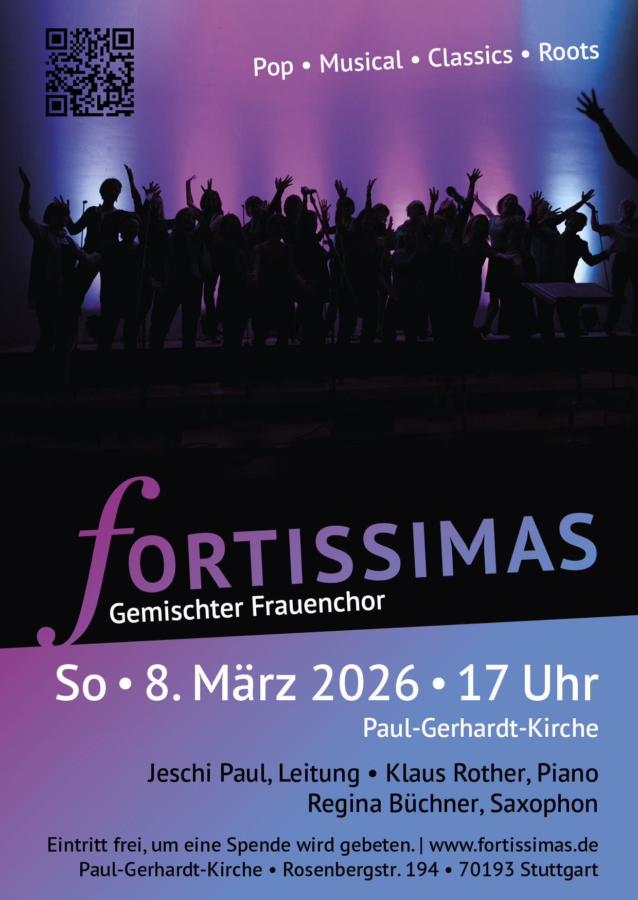 Die Sängerinnen des gemischten Frauenchors Fortissimas e.V. Stuttgart singen unter der künstlerischen Leitung der Sängerin und Chorleiterin Jeschi Paul, u.a. bekannt von der schwäbischen A-Capella-Gruppe „Pepper & Salt“ und dem Jazz-Ensemble „Ipanema Beach Hotel„.
